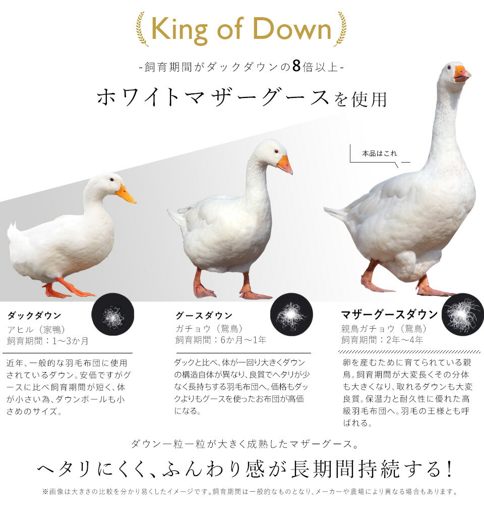商品 西川 マザーグース 羽毛布団 サイズ セミダブル 170cm(幅)×210cm(長さ) 素材 綿タイプの生地:綿100%(超長綿60サテン生地)清潔軽量タイプの生地:綿15%/ポリエステル85%(ダニプルーフ加工) 中 綿:ダウン93% フェザー7%(吉林省産ホワイトマザーグースダウン/420dp) 充てん量:1.3kg 重量 清潔軽量生地:約2.2kg(商品本体)綿100%生地:約2.6kg(商品本体) 備考 ※2022年10月より清潔軽量タイプの柄が変更になりました。